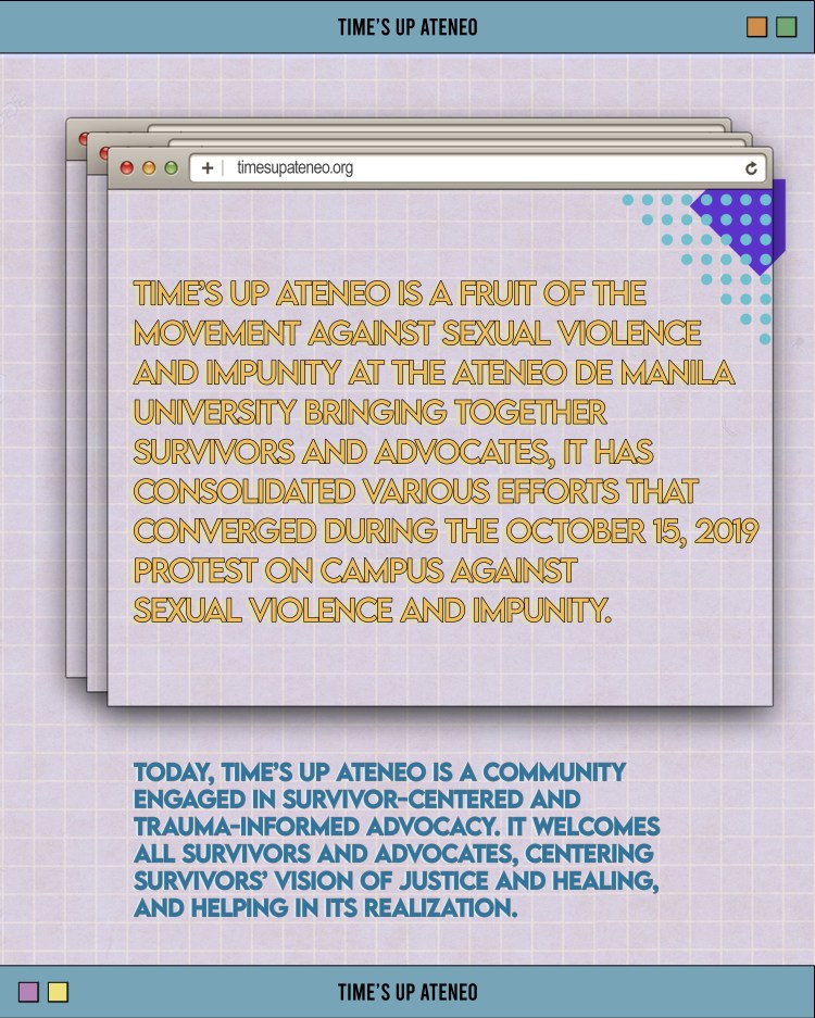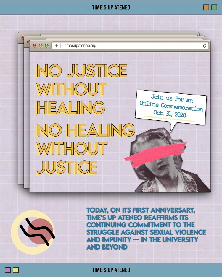 - No Justice Without Healing, No Healing Without Justice: An Online Commemoration (31 October 2020) – What has the past year of struggle been like, and what is the future of the movement? Join survivors and advocates in this online discussion on the legacy of the October 15 protest, its earlier roots, and the continuing struggle against sexual violence in the University and beyond. The discussion will be streamed live on Time’s Up Ateneo’s Facebook page (https://www.facebook.com/TimesUpAteneo) at 8:00 PM on 31 October 2020. Guests will be announced soon.
