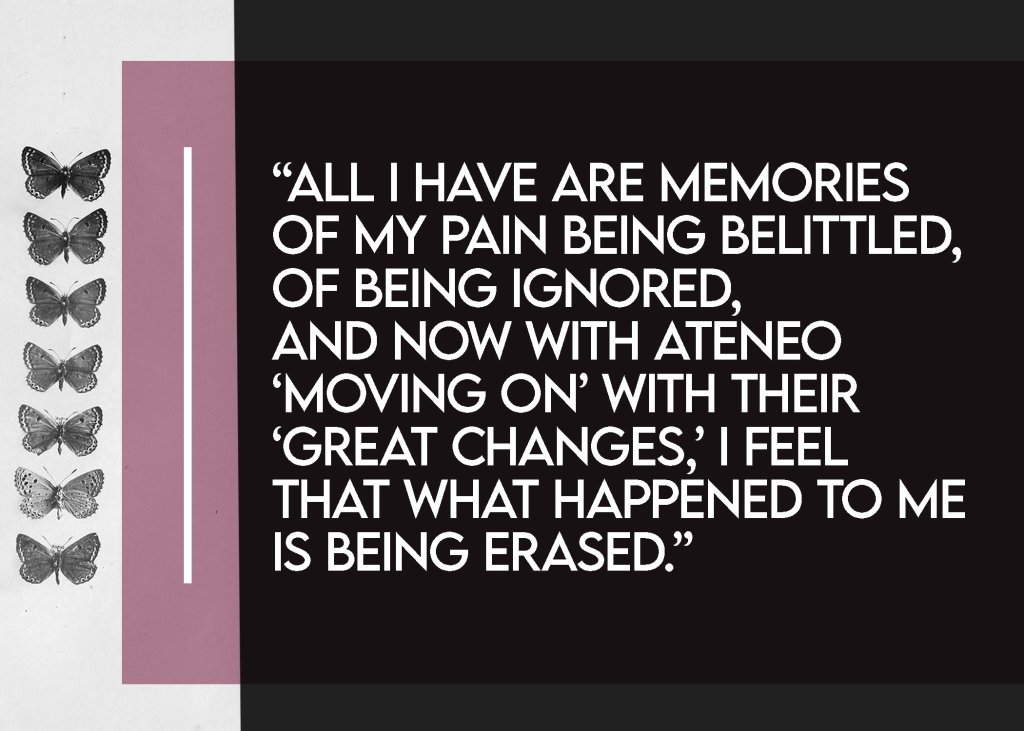 Recently, when I read the draft of the new code, I saw that it was an implicit concession that many of the things that Ateneo did to me were wrong because in the new code those things were no longer allowed, but I have never gotten even a mere apology from Ateneo for what they did to me. All I have are memories of my pain being belittled, of being ignored, and now with Ateneo “moving on” with their “great changes,” I feel that what happened to me is being erased. I will just be forgotten, and it’s easy to do that to me because I’m not important. Feeling ko alam din ‘yun ng harasser ko. Alam niya na makapangyarihan siya at ako hindi. Alam niya makakalusot at makakalusot siya sa mga ginagawa niya, slap on the wrist lang ang pinakamatinding mangyayari sa kanya. Whenever it counts, nakita ko nga kung paano siya kinampihan ng mga makakapangyarihan sa Ateneo.