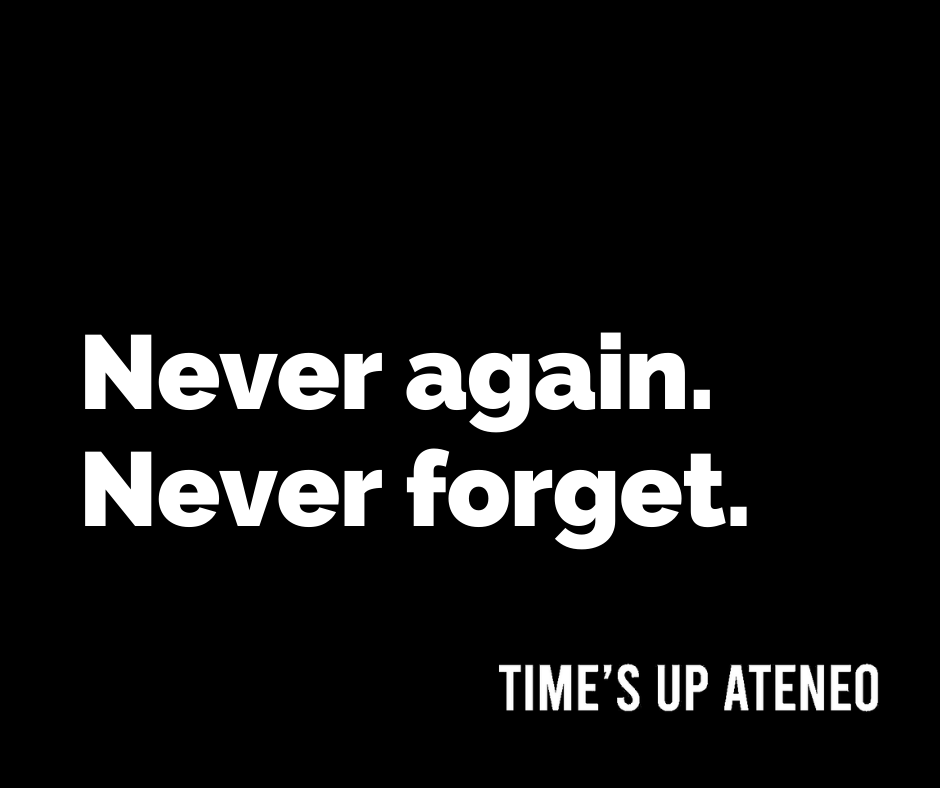 Time’s Up Ateneo is one with the Filipino people in advocating against all forms of violence. Let us all take part in the Filipino people’s struggle for freedom. This includes opposing the return of the Marcoses to power, and of all those who emulate their example. Never again, never forget.