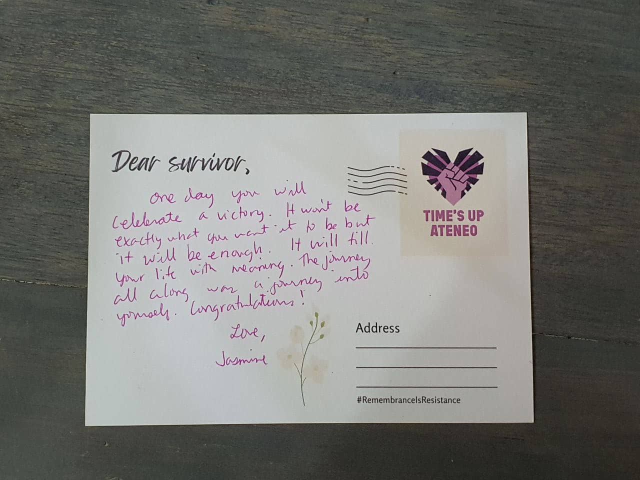 This is a postcard that was filled out during Time’s Up Ateneo’s creative action in Ateneo de Manila last Oct. 15, 2022 where we offered flowers at the site of the 2019 protest against sexual violence and impunity. Read about it and Time’s Up Ateneo’s other third year anniversary initiatives here https://timesupateneo.org/2022/10/18/times-up-ateneo-honors-survivors-and-protesters-with-flowers-a-collective-poem-and-postcards. You can also download theContinue reading “Postcards: Anonymous’ Stay strong”