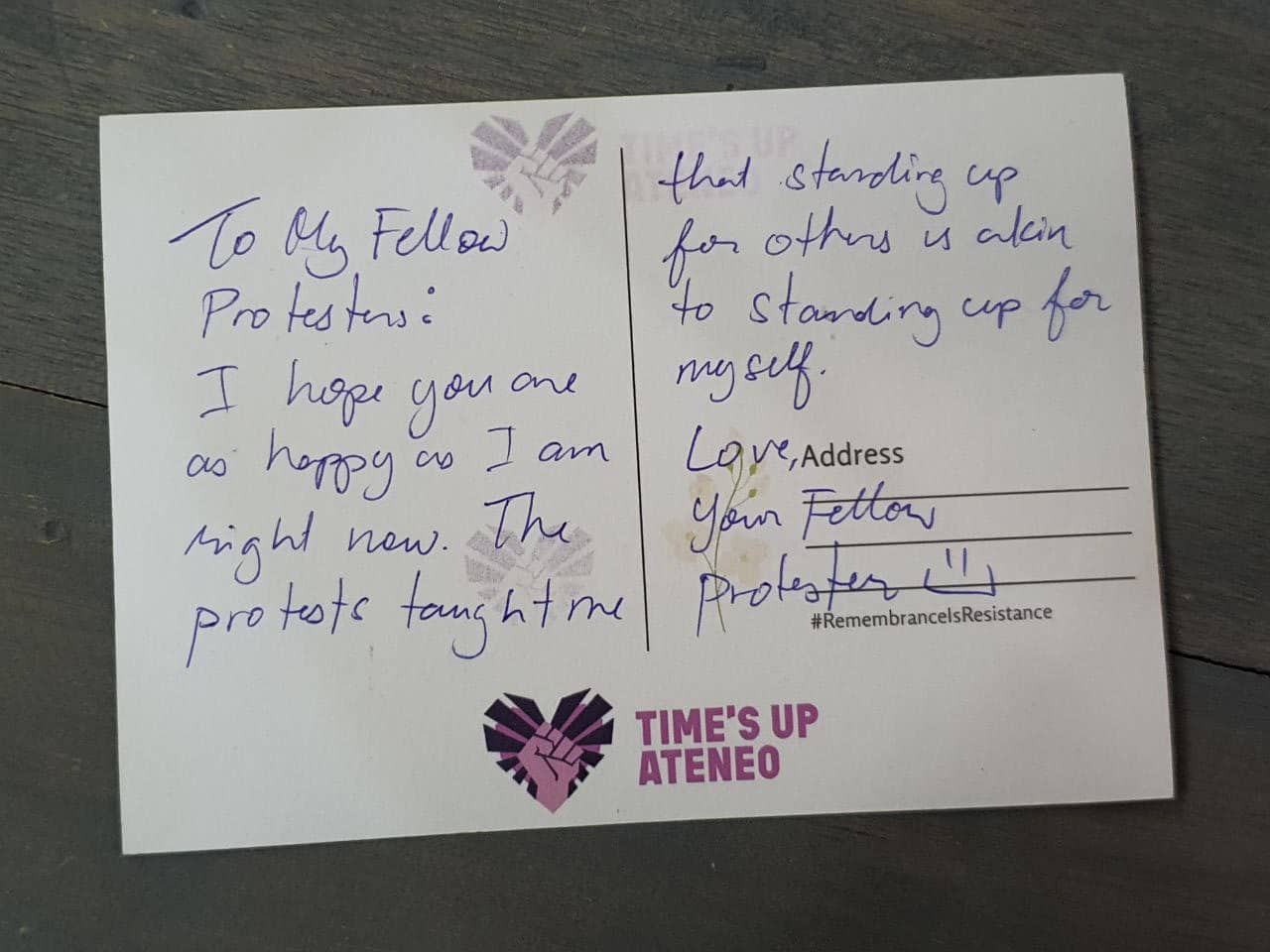 This is a postcard that was sent to Time’s Up Ateneo via social media. TUA distributed postcards during our creative action in Ateneo de Manila last Oct. 15, 2022 where we offered flowers at the site of the 2019 protest against sexual violence and impunity. Read about it and Time’s Up Ateneo’s other third yearContinue reading “Postcards: To those who stood up for what is just”